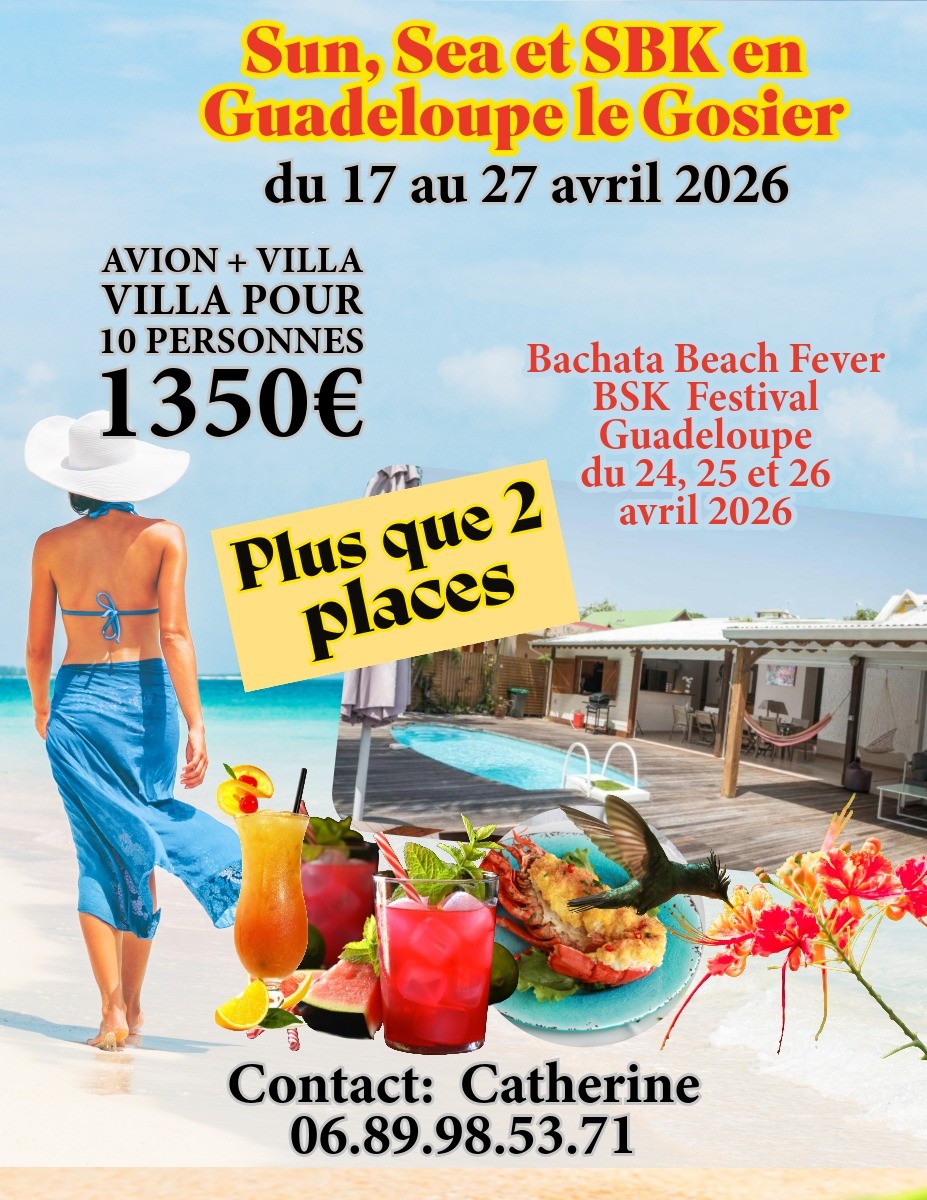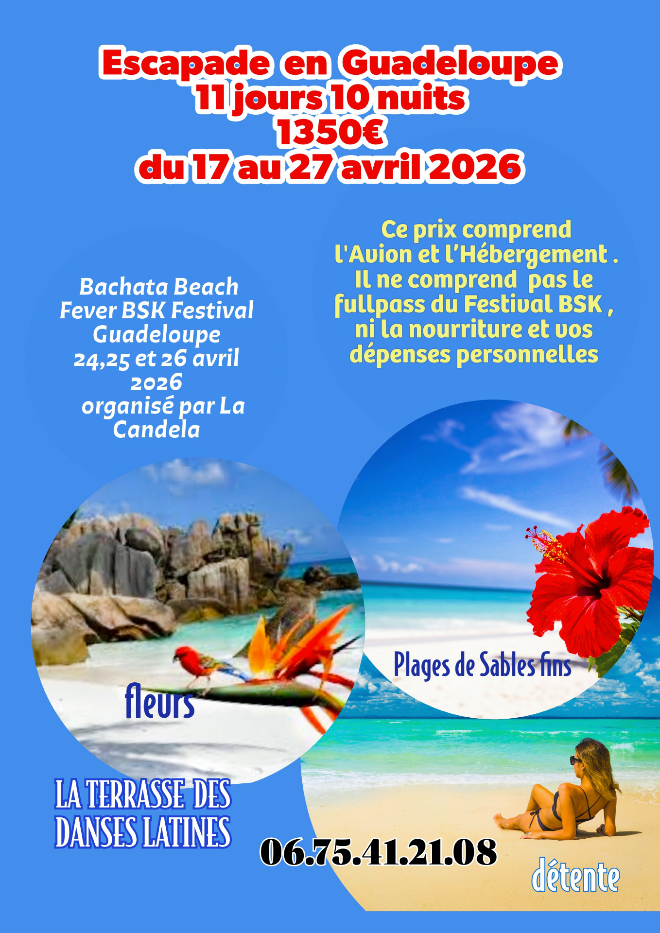 Tarif : 1350€ par personne – ne comprend le full pass pour le festival de Bachata Beach Fever bsk Guadeloupe, la nourriture, les depenses personnelles et les souvenirs.