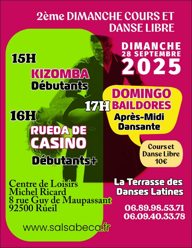 Vous êtes à la recherche d'une école de danse, d'un cours de danse, Cours de danse Kizomba Rueil, Bachata dominicaine, Bachata Moderne ou Sensual; Vous voulez vous amuser le Dimanche après-midi cours et danse libre Salsa Bachata Kizomba Rueil Malmaison Après-midi dansante Rueil: Cours de Kizomba, Salsa Bachata Que vous soyez seul ou en couple: nous pouvons vous satisfaire.
