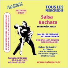 l'association salsabeca danses dans un soucis de bien faire à décider de regrouper les cours du mercredi et vendredi en seul Créneau. Les cours seront dispensés le mercredi au Centre d'Animation de Quartier Les Chênes - 5 rue du Professeur Louis René Nougier Suresnes 92150.