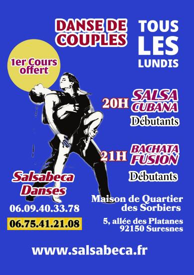 l'association salsabeca danses dans un soucis de bien faire à décider de regrouper les cours du mercredi et vendredi en seul Créneau. Les cours seront dispensés le mercredi au Centre d'Animation de Quartier Les Chênes - 5 rue du Professeur Louis René Nougier Suresnes 92150. |